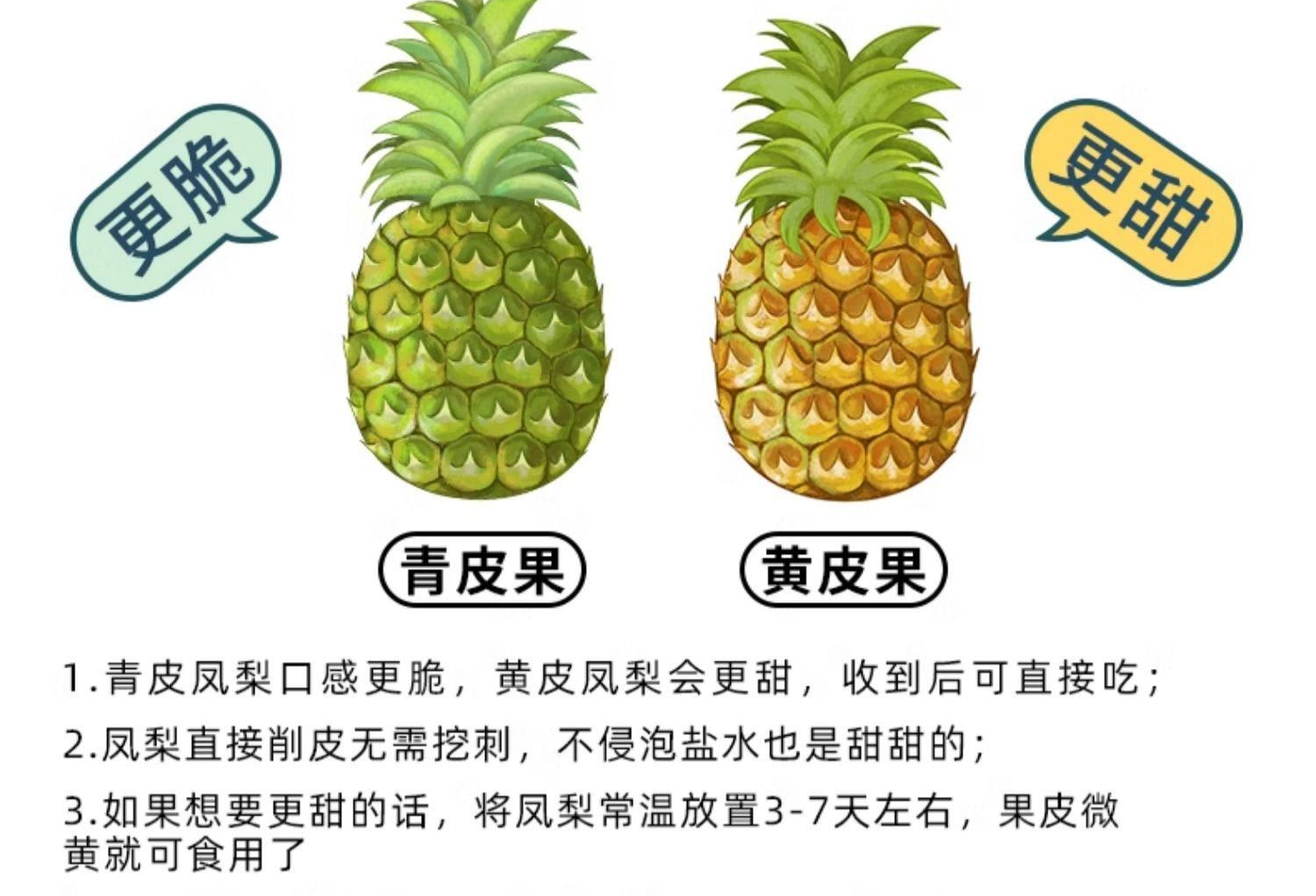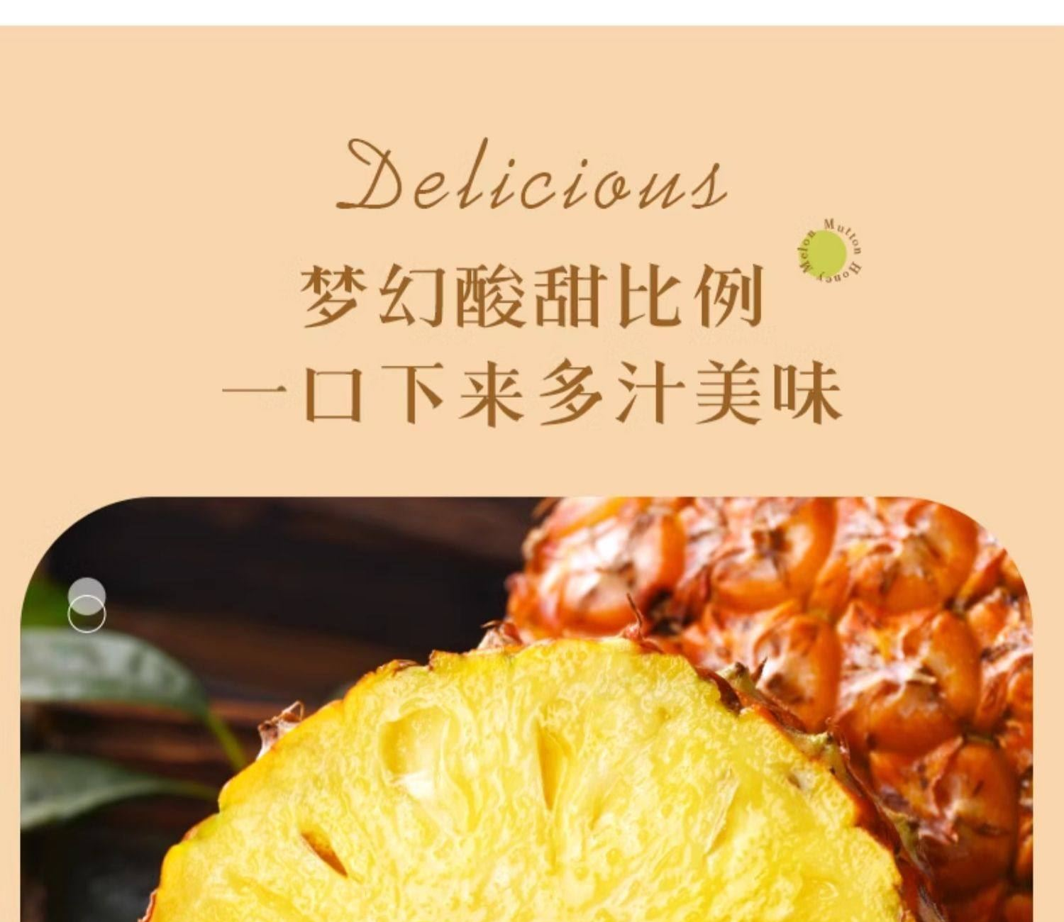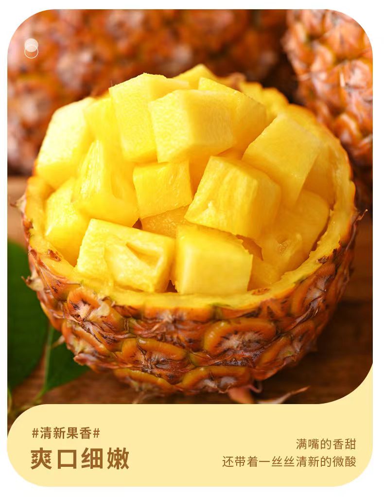 產(chǎn)地:海南 規(guī)格:8? 上市時(shí)間:9?中下旬 特點(diǎn):免泡鹽?、芯軟可?、甜度??不膩 營養(yǎng):富含菠蘿蛋?酶與維?素C,煥活肌膚 儲存:常溫