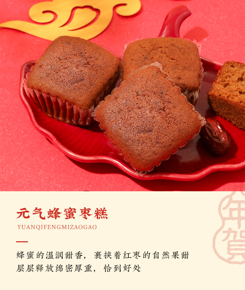 3、采用甘潤的蜂蜜與新疆紅棗為核心原料,天然甜美,紅棗與蜂蜜在烘烤后散發(fā)出濃郁的暖甜香氣,是充滿感的古早味小蛋糕